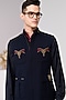 Featuring a navy waistcoat in poly blend viscose lycra base with structured flap pockets and embroidery. Accentuate it with trousers and pair of loafers for festive occasions or ceremonial events.