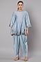 Featuring a dusty blue short kurta in chanderi base with floral applique hand embroidery and beadwork. It is paired with modal rayon dhoti. Accentuate it with dangler earrings and heels for a festive occasion, cultural event, wedding or engagement ceremony.