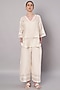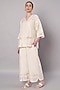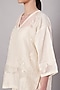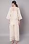 Featuring an ivory top in mul chanderi base with a v-neckline and floral applique hand embroidery. It is paired with chanderi wide-leg pants and a modal satin slip. Accentuate it with dangler earrings and heels for casual outing, brunch or festive family gathering.
