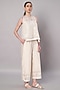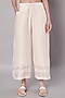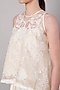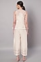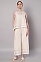 Featuring an ivory overlay top in mul chanderi base with floral applique embroidery. It is paired with chanderi pants. Accentuate it with dangler earrings and heels for casual outing, brunch or festive family gathering.