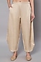 Featuring a champagne top in mul chanderi base with tie-up neckline and floral applique hand embroidery. It is paired with linen satin pants and a modal satin slip. Accentuate it with dangler earrings and heels for casual outing, brunch or festive family gathering.