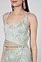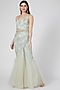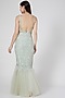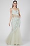 Featuring an icy mint blue gown in tulle and jersey lycra base with feathers, sequins, and crystal embroidery.