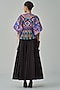 Saaksha and Kinni features a mesmerizing Black Skirt Set that captivates with its elegance. The eye-catching blue and multi-colored blouse is crafted in cambric with ikat print, hand micro pleat detailing and tie-up sleeves. It is paired with a poplin black high-waist skirt. Accessorize the designer skirt set with minimal jewellery and heels for a complete look, showcasing style and sophistication.