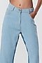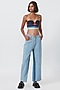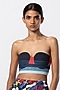 Featuring a blue bustier in denim base with tri-colour patchwork. It is paired with matching two-tone high-waisted jeans.