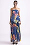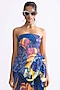 Saaksha & Kinni features a mesmerizing blue and multi-colored hand micro pleated skirt in chiffon base with tribal print. It is paired with a mushroom twill strapless peplum blouse having ruffle detailing Accentuate it with statement jewellery and heels for a sangeet or engagement ceremony.