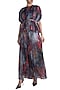 Featuring a grey kaftan style blouse in cotton silk base with abstract digital print including mirror and tassel embroidery. It has hand micro pleating, elasticated ruching on the belt and sleeves.