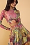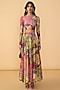 Featuring a multi-colored t-shirt style blouse in lycra base with a boast neck and abstract floral print. It is paired with a cambric printed maxi skirt. Style with layered jewelry and neutral heels to balance the prints. Ideal for destination sangeet or festive gathering.
