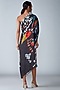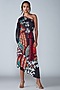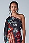 Featuring a multi-coloured one shoulder dress in chiffon and satin base with abstract print, mirror hand embroidery, thread work, tassels and a belt.