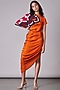 Featuring an orange draped dress in satin base with a draped shoulder.