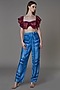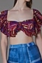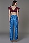 Featuring a multi-colored bralette in chiffon and satin base with hand micro-pleated frills and abstract print. It is paired with contrasting pastel blue pants having printed stripes.