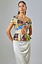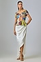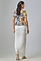 Featuring a multi-colored blouse in cambric base with abstract patchwork print and knot detailing. It is paired with a white satin high-waisted wrap skirt. Accentuate it with statement earrings and heels for an evening look.
