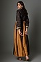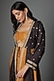 Featuring a mustard and black shrug in dola silk base with front tie-up and handwork. It is paired with a bustier and palazzo pants. Style it with dangler earrings and heels for any festive occasion or sangeet.