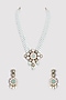 Featuring a long necklace studded with moissanite polki, green stones, beads and rice pearls, set in brass. It is paired with a matching pair of earrings. The necklace set is ideal for festive and wedding ceremonies.