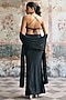 Featuring a black skirt in spandex base with a thigh-high slit. It is paired with a spandex and poly knit bralette style blouse having a sweetheart neckline, delicate straps and rhinestone embellishments, including a dupatta. Elevate this set with metallic heels and a statement clutch for a refined touch. Perfect for cocktail nights, engagement parties, or evening celebrations.