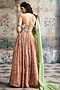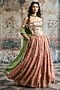 Featuring a pink lehenga in organza base with floral print. It is paired with an embroidered strapless blouse and a green dupatta. Accentuate with statement jewellery and heels for a wedding or a sangeet ceremony.