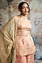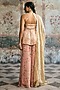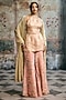 Featuring a peach kurta in brocade base with embroidery. It is paired with blush pink floral printed wide-legged sharara pants and a sheer dupatta. Accentuate with statement jewellery and heels for a wedding or sangeet ceremony.