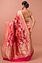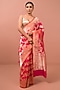 Featuring a pink-orange handloom saree in mashru satin banarasi base with an attached blouse piece, including meenakari, boota and zari work. Accentuate with dangler earrings and heels for a wedding or festive ceremony.
