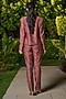 Featuring a burgundy jacket in pure moonga silk base with floral woven motif details. It is paired with pants. Style it with delicate jewellery and strappy heels for a graceful look. Perfect for semi-formal gatherings, elevated evenings, and grand soirees.