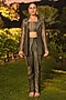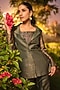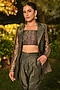 Featuring a green blazer in pure moonga silk base with kani and floral weave details. It is paired with a bustier and pants. Style it with delicate jewellery and strappy heels for a graceful look. Perfect for semi-formal gatherings, elevated evenings, and grand soirees.