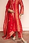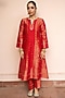 Featuring a red A-line kurta in vegan silk base with paisley jaal and zari gota detailing. It is paired with pants and a dupatta. Style it with polki earrings, block heels and an embellished clutch, perfect for diwali celebrations or cozy family get-togethers.