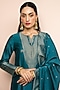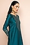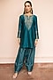Featuring a teal kurta in vegan silk base with zari gota weave detail. It is paired with farshi salwar pants and a dupatta. Style it with polki earrings, block heels and an embellished clutch, perfect for diwali celebrations or cozy family get-togethers.
