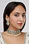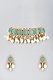 Featuring a gold finish necklace studded with blue carved stone, kundan polki, and faux diamond, set in mixed metal. It is paired with a matching pair of earrings.