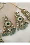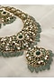 Featuring a gold finish choker necklace studded with green kundan polki and beads, set in mixed metal. It is paired with a matching pair of earrings. Add a touch of sparkle to your ensemble, perfect for wedding ceremonies or festive celebrations.