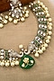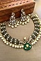 Featuring a gold finish choker necklace studded with green kundan polki and emerald beads, set in brass. It is paired with a matching pair of earrings. Perfect for grand occasions like weddings and traditional festivities.