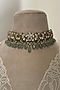 Featuring a gold finish choker necklace studded with kundan polki, green stones and beads, set in mixed metal. It is paired with a matching pair of earrings. Add a touch of sparkle to your ensemble, perfect for wedding ceremonies or festive celebrations.