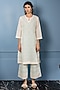 Featuring a white handloom kurta in jacquard chanderi base with hand embroidered lace detailing and shisha brooches. It is paired with matching chanderi palazzos, a bandhani slip, and a turquoise cotton bandhani dupatta having hand embellished zari tassels.