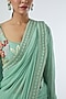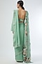 Featuring a sky blue saree in organza base with motifs and 3D applique embroidery. It is paired with a matching silk handcrafted blouse and a petticoat.