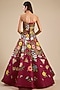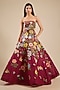 Featuring a maroon off-shoulder gown in organza base with floral motif and 3D applique embroidery. Accentuate it with statement earrings and block heels for a wedding or sangeet ceremony.