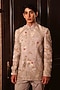 Featuring a grey bandhgala in matka silk base with applique and hand embroidery. It is paired with trousers. Style it with mojaris for a wedding, sangeet or engagement wear.