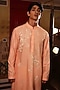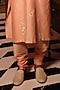 Featuring a pink kurta in katan silk base with applique, floral and hand embroidery. It is paired with churidar. Style it with mojaris for a festive occasion, cultural event, wedding or engagement wear.