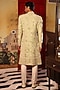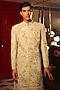Featuring a pista green sherwani in matka silk base with embellishments, applique and hand embroidery. It is paired with trousers. Style it with mojaris for a wedding, sangeet or engagement wear.