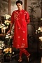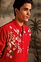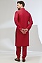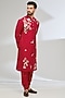 Featuring a red kurta in katan silk base with laser-cut embroidery. It is paired with pants. Style it with loafers for a royal and refined look, perfect for a festive occasion or wedding ceremony.