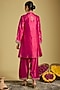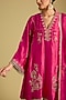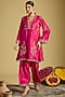 Featuring a deep pink kurta in kora dupion base with bird motifs, floral and zardosi work, including pearl tassel hanging. It is paired with kora dupion salwar pants and an organza tissue dupatta. Style it with statement jewellery, block heels and an embellished clutch for festive occasions or wedding ceremonies.