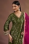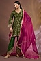 Featuring a green kurta in banarasi katan silk and chiniya silk base with zardosi and glass beads embroidery. It is paired with salwar pants and a pink silk organza dupatta. Accentuate it with statement earrings and heels for festive occasions, sangeet or pre-wedding ceremonies.