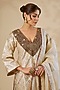 Featuring an ivory A-line short kurta in banarasi silk base with v-neckline and zardosi work. It is paired with chennai silk salwar and a silk organza dupatta. Accentuate it with polki jewellery and block heels for festive occasions or a pooja ceremony.
