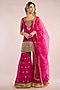 Featuring a fuchsia A-line kurta in chanderi base with gota patti embroidery. It is paired with gharara and an organza dupatta. Accentuate it with statement earrings, a sleek braid, and metallic heels, ideal for sangeet ceremonies or weddings.