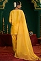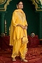 Featuring a yellow A-line short Choga in chanderi base with three-quarter sleeves, gota embroidery and neck design detail. It is paired with salwar pants, a sheer organza dupatta and a potli. Accentuate it with statement jewellery and heels for a festive occasion, an intimate pooja or sangeet ceremony.