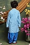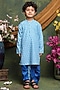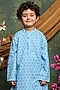 Featuring a blue kurta for boys in cotton blend base with geometric print. It is paired with blue dhoti pants. Style it with a watch and pair of mojris for a festive occasion or sangeet ceremony.