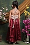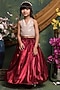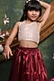 Featuring a maroon flared lehenga for girls in georgette and tissue base. It is paired with an off-white halter choli. Style it with cute hair accessories and sandals for a festive occasion or sangeet ceremony.