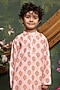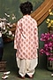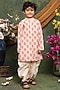 Featuring a peach kurta for boys in cotton blend base with geometric print. It is paired with cream dhoti pants. Style it with a watch and pair of mojris for a festive occasion or sangeet ceremony.