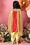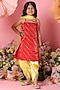 Featuring a red kurta for girls in silk blend base with embroidery. It is paired with yellow dhoti pants and a sheer dupatta. Accessorize it with matching hair accessories and sandals for a stylish ensemble, ideal for any festive occasion.