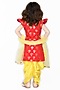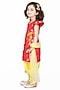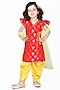 Featuring a red kurta for girls in banarasi jacquard base. It is paired with contrasting yellow art silk and sequins net dhoti pants and a net dupatta.