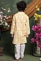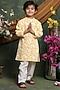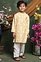 Featuring a yellow kurta for boys in pure cotton base with floral print. It is paired with white pants. Style it with a watch and pair of mojris for a festive occasion or haldi ceremony.