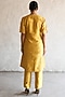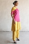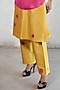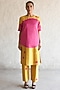 Featuring an ochre yellow and fuchsia pink A-line handcrafted kurta in banarasi cotton silk base with applique hand embroidery. It is paired with straight pants. Accentuate it with statement earrings and block heels for festive occasions.