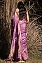 Featuring a plum purple saree in tussar silk base with golden zari and gold patchwork embroidery. It comes with an attached unstitched blouse piece.