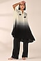 Featuring a charcoal black ombre kaftan in italian crepe base with patch work and hand embroidery. It is paired with straight pants. Accentuate it with dangler earrings and block heels for casual outings, brunches, sundowner or evening gatherings.